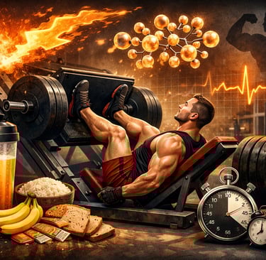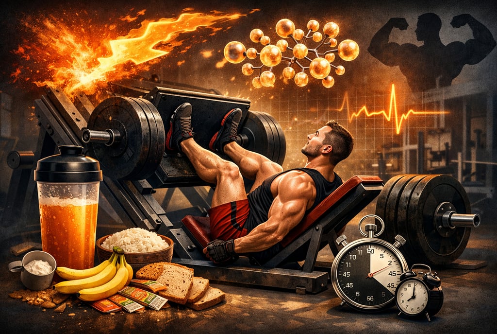 Treinos que envolvem grandes massas musculares (como o agachamento) geram maior fadiga metabólica. Os estudos mostraram que o carboidrato brilha especialmente em treinos de membros inferiores, onde o gasto energético é massivo.